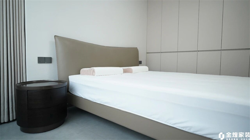 主卧采用了极简的设计语言,白色墙面搭配灰色地砖,配合大面积的落地窗,营造出宽敞明亮的空间感。简约风格的皮艺床,搭配质感柔和的床品,营造出宁静且优雅的休息氛围。