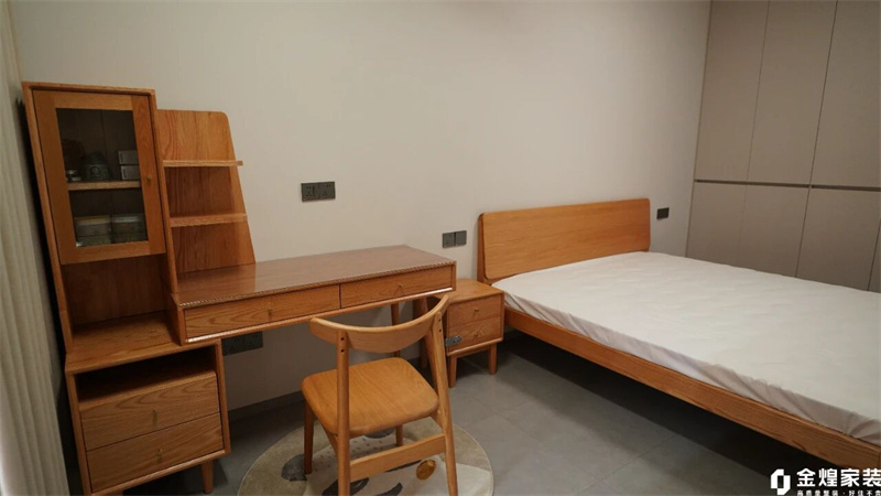 次卧更注重实用与自然质感。采用整套原木色家具,搭配柔和的灯光设计,让整个空间显得舒适宜人。书桌的设计简洁大方,同时配有多功能储物柜,既节省空间,又增加了实用性。