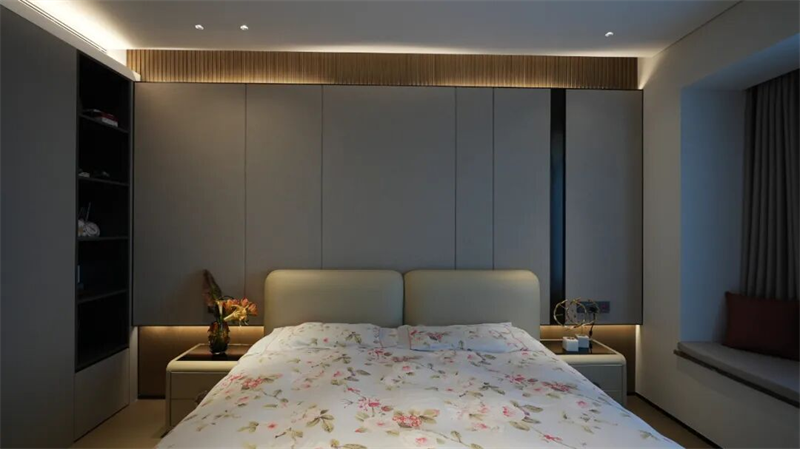 主卧整体色调沉稳柔和,灰色软包背景墙搭配木饰线条与隐藏式灯带,营造出静谧而高级的睡眠氛围。米色皮质大床配花卉图案床品,增添一抹自然柔美,让空间更具温度。一侧开放式衣柜与嵌入式收纳结合,满足衣物与饰品的分类存放需求,兼顾美观与实用性,打造一个整洁有序的私密空间。