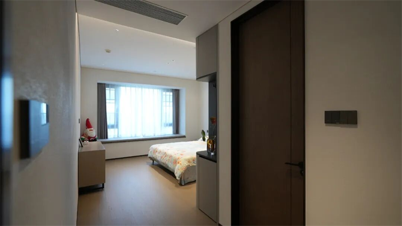 次卧以简约现代风格为主,整体色调柔和宁静,浅灰墙面搭配原木色地板,营造出舒适放松的睡眠氛围。一侧定制整墙衣柜,兼具收纳与展示功能,柜体线条简洁,与墙面自然融合,提升空间整洁度。大窗户配纱帘与遮光帘,采光充足且私密性良好,为日常起居提供明亮舒适的环境。