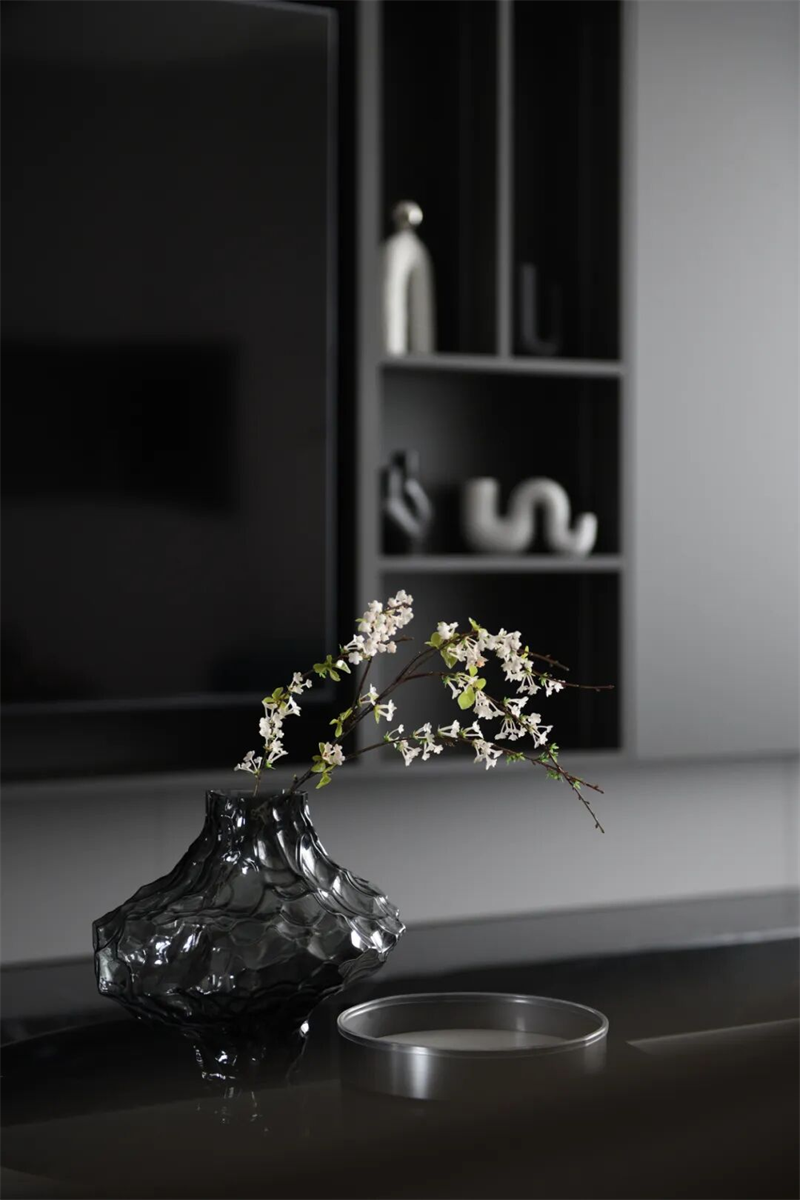 餐厅整体色调统一,以灰白为主,营造出沉静而高级的用餐氛围。黑色大理石餐桌质感细腻,搭配深色皮质餐椅,线条简洁流畅,坐感舒适且富有设计感。桌面上摆放透明花瓶与绿植,为冷调空间增添一抹自然生机。