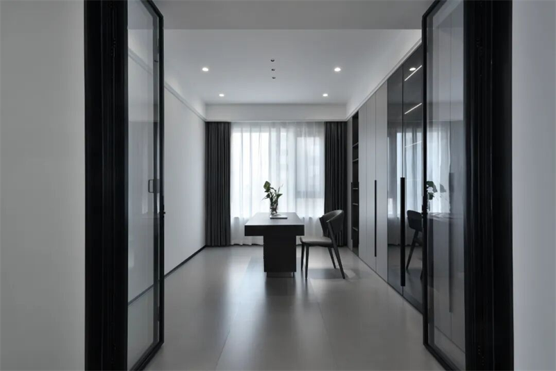 书房空间通透宁静,以灰白为主调。黑色金属框玻璃门隔断,既保证私密性,又不影响采光与视线通透。室内地面铺设灰色哑光地砖,墙面简洁无饰,突出空间的纯粹感。整体布局简洁有序,摒弃多余装饰,打造一个安静、高效、富有质感的独立思考与工作空间,让思绪在静谧中自由流淌。