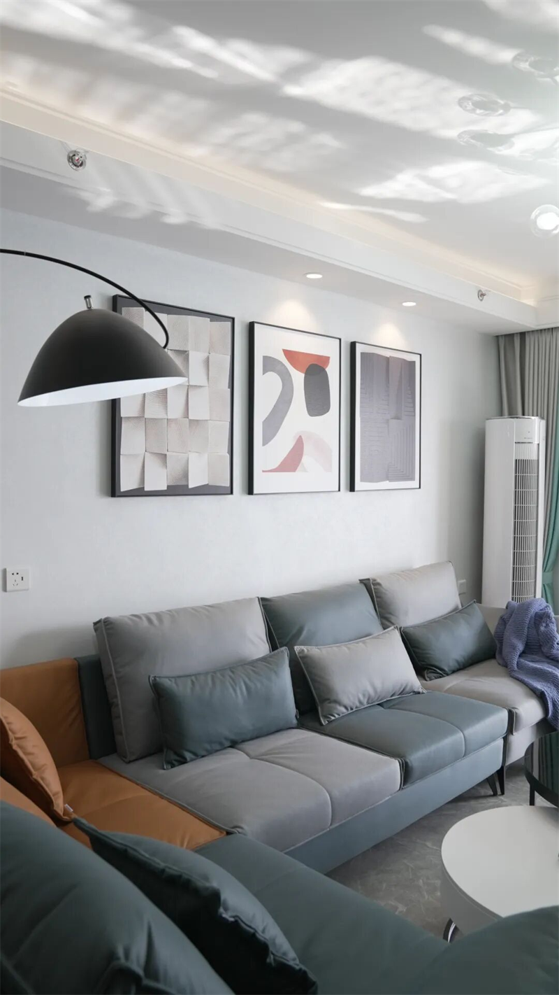 客厅以现代简约风格为基调,巧妙融合功能与美学,营造出舒适而富有格调的生活空间。灰蓝色与暖棕的拼色沙发,既提升了视觉层次感,又带来温暖的居家氛围;搭配圆形金属茶几与黑白撞色设计,简洁而不失设计感。
