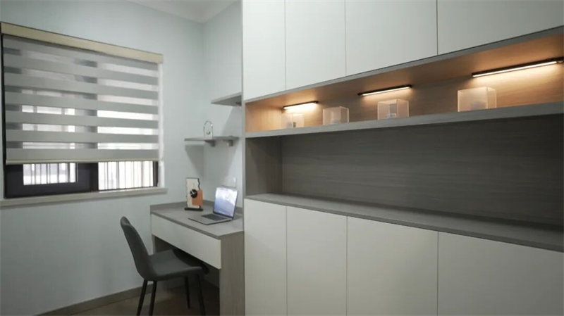 书房以极简设计营造静谧专注的氛围,浅灰蓝墙面搭配木纹与哑光白柜体,构建出沉稳而不失温度的视觉基调。定制一体式书桌与储物柜巧妙结合,最大化利用空间,兼具收纳与办公功能。开放式层架内嵌柔和灯带,不仅提升照明层次,更为空间增添现代感与仪式感。