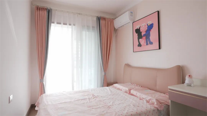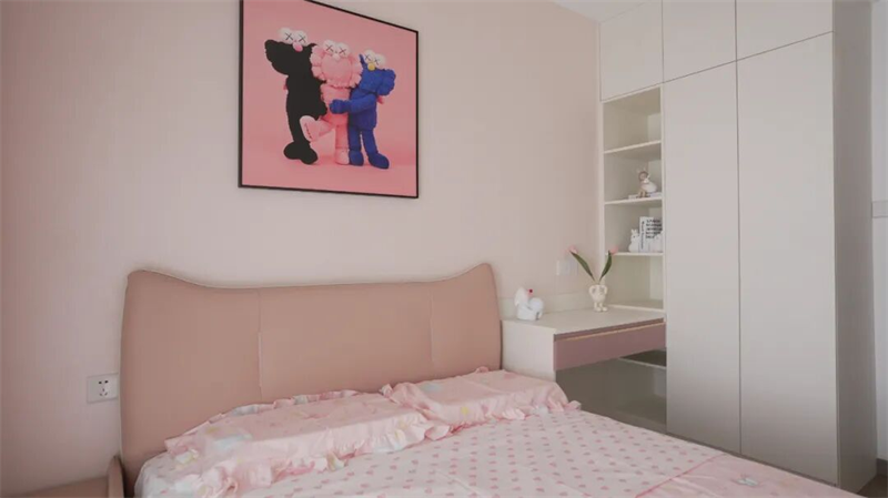 儿童房以温柔的粉色为主调,营造出梦幻而温馨的成长空间。柔和的粉墙搭配同色系软包床头与床品,点缀星星、云朵图案,仿佛将童话轻轻铺展在眼前。窗边垂落的粉灰拼色窗帘,透光而不失私密,让阳光洒入时也带着一丝俏皮。墙上悬挂的潮流艺术挂画,融合童趣与时尚感,为房间注入个性与活力。