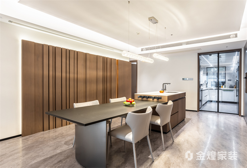 该设计以无主灯设计、岩板与木作结合,打造通透大气的现代轻奢大平层,兼具质感与生活温度。