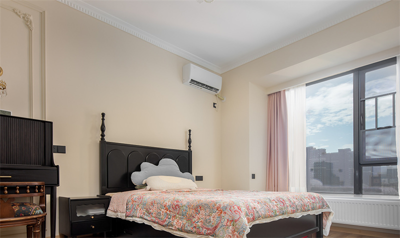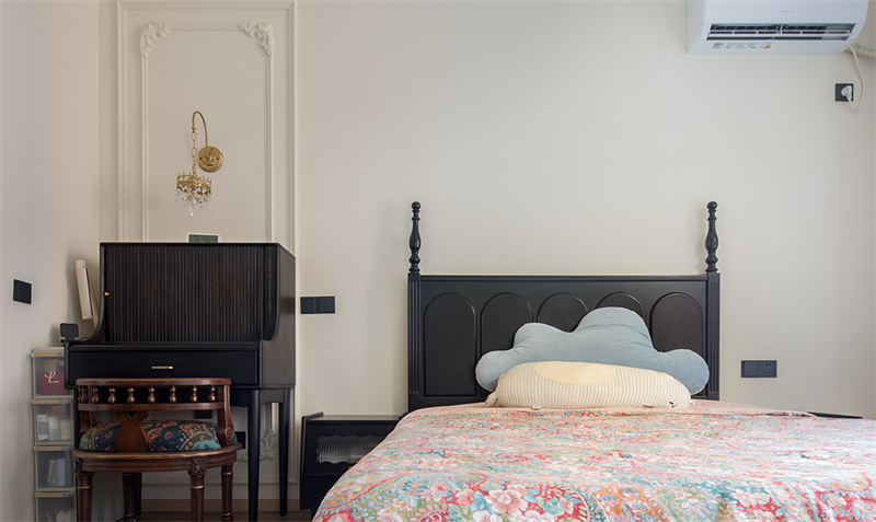 主卧延续了整体的色系搭配法则。大面积奶油色调让整个空间看起来复古又慵懒。背景墙搭配了款式简约的石膏线条,恰到好处地增添了精致感。黑色木质床架与色彩丰富的床上用品搭配,既经典又不失活力,让人感受到法式风情的独特魅力。