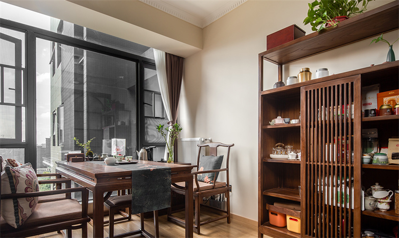 书房深色木质书桌和椅子散发出浓郁的古典韵味,与浅色墙面形成鲜明对比,既庄重又不失温馨。书架的装饰品和绿植点缀其间,为整个空间增添了几分生机与活力。无论是阅读、写作还是思考,这里都能提供一个舒适、专注的环境。