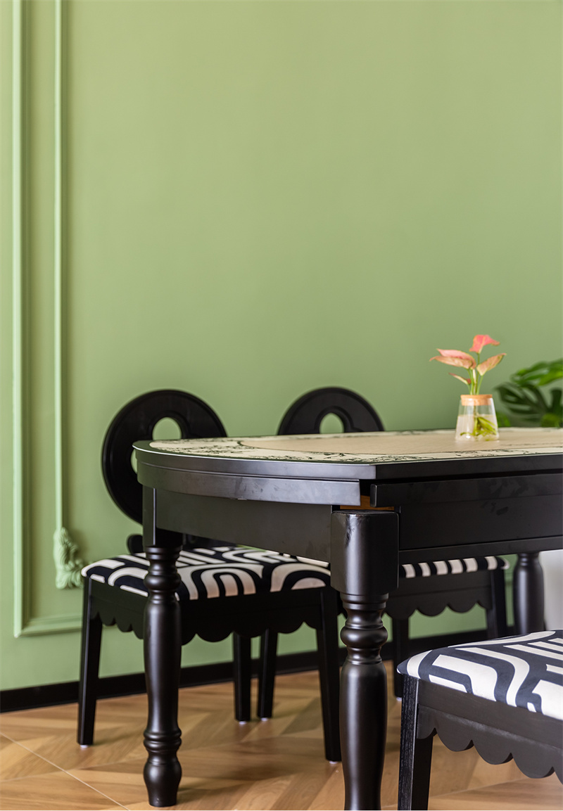 餐厅定制了整排收纳柜,承担了收纳+餐边柜功能。原木餐桌搭配复古吊灯,营造出自然温馨的就餐环境。背景墙整面做绿色装饰,与白墙和黑色的餐桌椅组合,彰显出自由、灵动的美学意蕴。